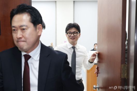 [서울=뉴시스] 한동훈 국민의힘 대표가 11일 서울 여의도 국회 당대표실에서 회의를 하던 중 잠시 문을 열어 장동혁 등 의원들을 배웅하고 있다. 2024.12.11. |