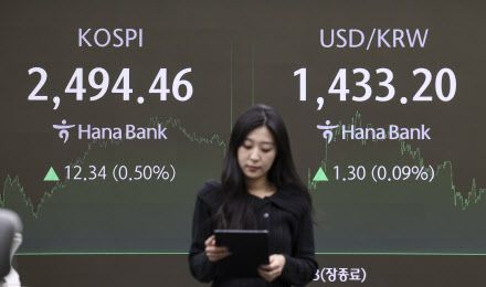 △지난 13일 서울 중구 하나은행 본점 딜링룸에 전광판에 지수가 나오고 있다. 이날 코스피는 전 거래일(2482.12)보다 12.34포인트(0.50%) 오른 2494.46에 마감했다. (사진=뉴시스) |