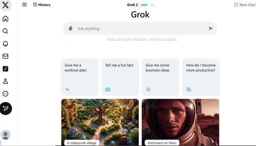 엑스 이용자는 메뉴 줄에서 그록 아이콘을 눌러 그록2 페이지에 접속할 수 있으며, "무엇이든 물어보세요"라고 쓰인 대화창을 통해 챗봇을 이용할 수 있다.
