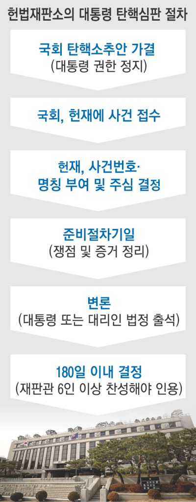 헌재 재판관들은 일요일인 15일 출근하지 않고 자택에서 각자 사건 검토에 들어갔다. 헌재는 전날 오후 6시15분 윤 대통령에 대한 탄핵심판 사건을 국회로부터 공식 접수했다. 헌재는 향후 심리 절차 등 논의에 착수했다. 앞으로 헌재는 준비절차에서 쟁점과 증거정리를 거쳐 본격 심리에 나설 예정이다. 윤 대통령에 대한 탄핵은 쟁점이 복잡하지 않아 준비절차 없이 바로 변론에 들어갈 수도 있다는 예측이 헌재 주변에서 나왔지만 헌재는 준비절차를 거치겠다고 밝혔다. 변론 준비절차에서는 탄핵심판 사건의 쟁점을 정리하게 된다. 노무현 전 대통령 때는 준비절차 없이 바로 변론에 들어갔고, 박 전 대통령 때는 준비절차를 거쳤다.