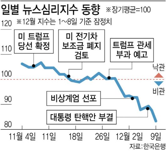 한은이 경제뉴스를 통해 측정하는 뉴스심리지수(NSI)가 100 내외에서 등락하다 12월 들어 83.2로 크게 하락하며 2022년 12월(82.6) 이후 가장 낮은 수준을 기록했다. 경기 침체기의 심리 수준이라는 분석이다.