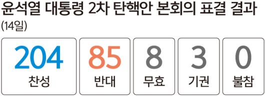 앞서 한 대표는 윤 대통령 탄핵 찬성 입장을 밝혔지만, 반대 당론은 뒤집히지 않았다. 실제 표결에서는 12표의 이탈표가 나와 탄핵안은 찬성 204표, 반대 85표, 무효 8표, 기권 3표로 가결됐다.