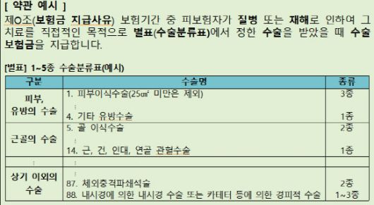 치료 명칭에 ‘수술’ ‘-술’이라는 표현이 있더라도 약물을 주입하거나 주사기 등으로 빨아들이는 행위도 수술 보험금을 받을 수 없다. 또 치료 내용이 약관상 수술 분류표에 열거된 수술의 종류에 해당하지 않으면 수술 보험금을 받지 못할 수 있다. 상품마다 내용이 다를 수 있는 만큼 약관을 반드시 확인해야 한다. 약관에 보장 가능한 수술의 종류를 구체적으로 열거한 상품이 있는가 하면, 수술의 정의만 정하고 있는 상품도 있다.