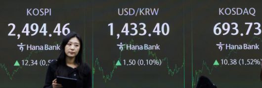 13일 오후 서울 중구 하나은행 본점 딜링룸의 전광판에 이날 거래를 마감한 코스피와 코스닥 지수와 거래 중인 원·달러 환율이 표시돼 있다. (사진=연합뉴스) |