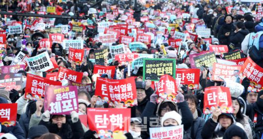 [이데일리 방인권 기자] 윤석열 대통령에 대한 탄핵소추안 재표결이 실시된 14일 오후 서울 여의도 국회의사당 앞에서 열린 윤석열 즉각 탄핵 범국민 촛불대행진에 참여한 시민들이 구호를 외치고 있다. |