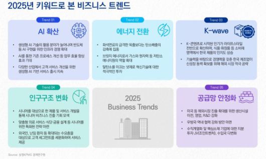 보고서는 2025년 주목할 비즈니스 트렌드로 △AI 확산 △에너지 전환 △K-wave(한류) △인구구조 변화 △공급망 안정화를 꼽았다.
