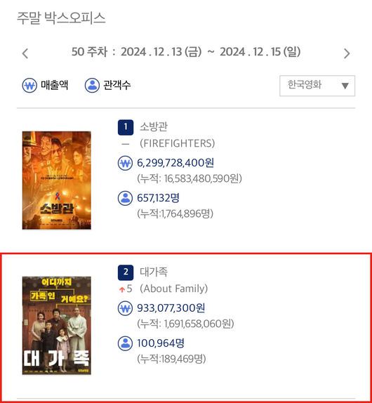 영화 '대가족'과 '소방관'이 주말 박스오피스 흥행을 견인하며 한국영화 쌍끌이 흥행을 이끌고 있다. 한국영화 박스오피스 순위에서 나란히 TOP2를 기록한 두 영화는 온기가 필요한 연말, 극장가에 감동과 울림이 있는 훈훈함을 전하며 각기 다른 매력으로 관객들을 극장가로 불러들였다. 특히 '대가족'은 감동과 웃음, 그리고 영화가 끝난 뒤 생각할 만한 화두까지 던지는 작품으로 개봉 전부터 진행된 시사회를 통해 호평을 차곡차곡 쌓아 온 바, 개봉주 주말 제대로 흥행 포텐을 터뜨렸다.