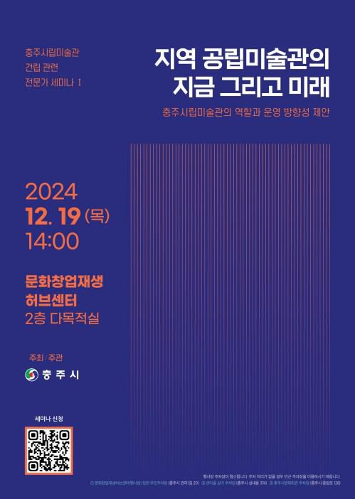 (충주=연합뉴스) 충북 충주시는 오는 19일 오후 2시 성내동 문화창업재생허브센터에서 '지역 공립미술관의 지금 그리고 미래'를 주제로 전문가 세미나를 연다고 16일 밝혔다.