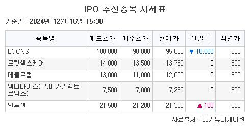 상장 예비심사 승인 종목으로 종합 IT 서비스 전문기업 LGCNS는 호가 9만5000원으로 9.52% 하락 마감했고, HA필러 및 의료기기 제조업체 아크로스(-1.64%)도 하락 조정을 받았다.