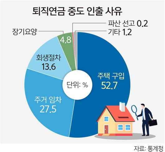 중도인출 사유(인원 기준)는 주택 구입이 52.7%로 가장 큰 비중을 차지했고, 주거 임차(27.5%), 회생절차(13.6%) 순이었다. 연령대별로는 20대 이하는 주거 임차, 나머지 연령대는 주택 구입 목적의 중도인출이 각각 가장 많았다.