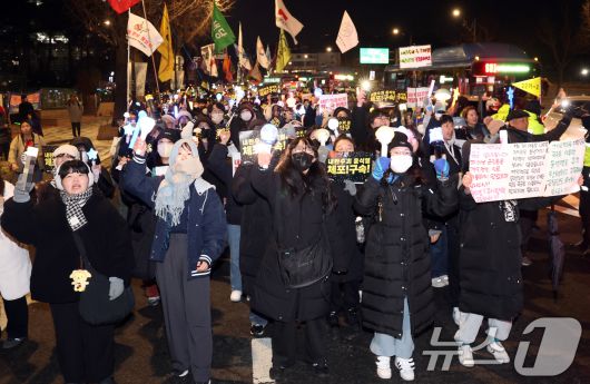 (서울=뉴스1) 김명섭 기자 = 16일 오후 서울 종로구 경복궁 동십자각 일대에서 열린 '윤석열 즉각 파면·처벌 사회대개혁 시민대행진'에서 참가자들이 구호를 외치며 행진하고 있다. 2024.12.16/뉴스1
