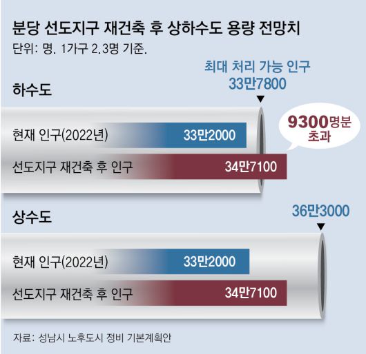 공람안에 따르면 분당 하수처리시설의 최대 처리 용량은 33만7800명분이다. 선도지구 재건축이 완료되면 분당 인구수가 33만2000명(2022년)에서 34만7100명으로 늘어나면서 하수처리 용량을 9300명분 넘어서게 된다. 주택 증가분 6568채에 가구당 인구수를 2.3명으로 가정해 계산한 결과다.