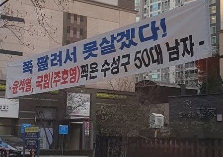 “윤석열, 국힘(주호영) 찍은 수성구 50대 남자”라고 밝힌 한 시민이 대구 수성구 범어동의 한 아파트 입구에 내건 것이다. 이 펼침막은 12·3 내란사태를 일으킨 윤 대통령, 탄핵을 반대한 국민의힘과 이 지역구의 주호영(대구 수성갑) 의원을 부끄러워하는 내용이다.