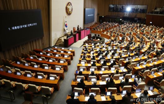 우원식 국회의장이 지난 14일 오후 서울 여의도 국회에서 열린 제419회국회(임시회) 제4차 본회의에서 윤석열 대통령 탄핵소추안 가결을 알리고 있다. /사진=뉴스1 |