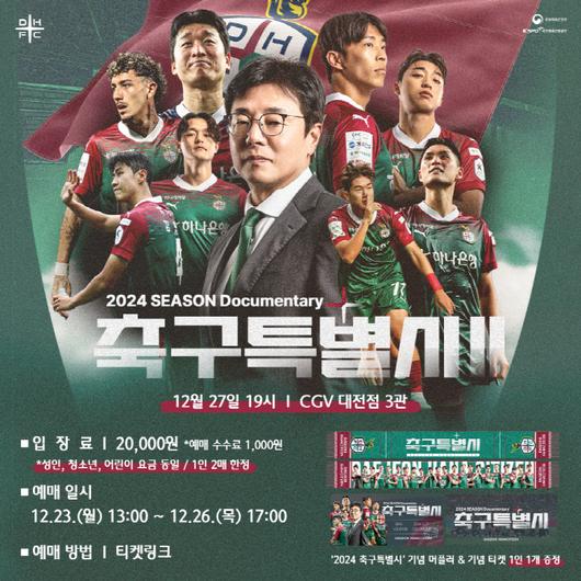 대전의 2024시즌 다큐멘터리 ‘축구특별시2’ 상영회는 27일 오후 7시 CGV 대전점에서 진행된다. 상영회 참가자에게는 기념 머플러와 티켓 등 다양한 이벤트가 진행된다.