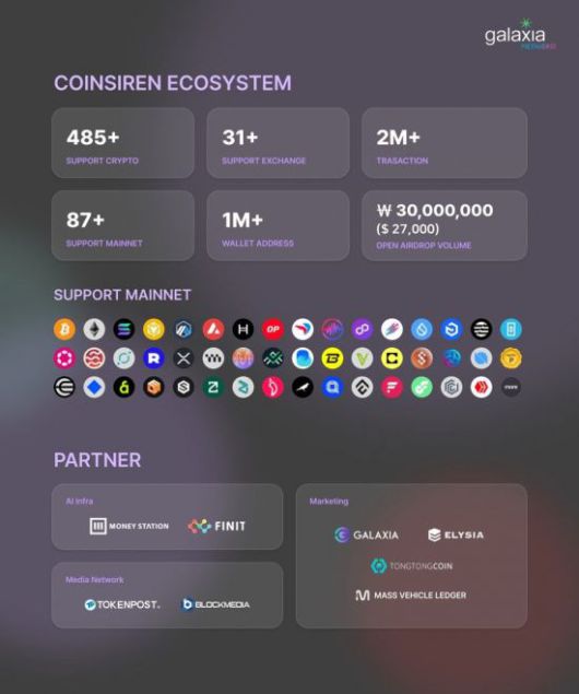 홍진표 갤럭시아메타버스 대표는 "코인사이렌은 디지털 자산 투자자들이 이전에는 알 수 없었던 필요한 정보를 한 눈에 볼 수 있도록 제공함으로써 보다 안전하고 효율적인 투자 환경을 조성할 것"이라며 “파트너사들과 함께 글로벌 마케팅을 진행해 동남아 시장을 중심으로 한 확장할 계획"이라고 말했다.