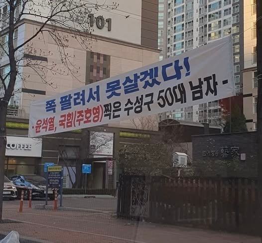 사진에는 대구 수성구 범어동의 한 아파트 입구에 "쪽팔려서 못 살겠다! 윤석열, 국힘(주호영) 찍은 수성구 50대 남자"라고 쓴 현수막이 걸린 모습이 찍혔다. 이 아파트의 최근 매매 실거래가는 12억 3000만원으로, 이 지역은 '대구의 강남'이라고 불린다.