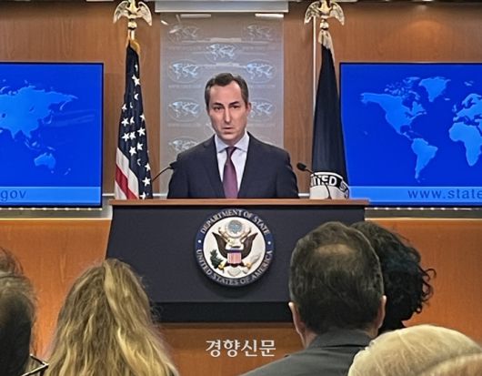 매슈 밀러 미국 국무부 대변인이 9일(현지시간) 국무부 청사에서 브리핑을 하고 있다. 워싱턴 | 김유진 특파원 |