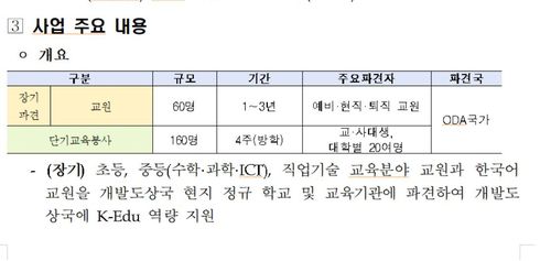 2013년 시작된 교원해외파견사업은 25개 공적개발원조(ODA) 국가에 우수 교사를 파견해 현지 학교에서 수학, 과학, 컴퓨터, 미술, 한국어 등의 교과목을 가르치는 사업이다. 현재 선발 기준 누적 교사는 729명이다.