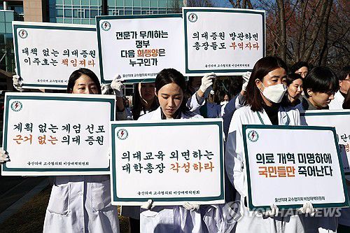 울산의대 교수 비상대책위원회(비대위)는 호소문을 내고 "2천명 의대 증원 발표는 의사들에게 윤석열의 비상계엄 선포와 같았다"며 "정부는 각종 행정명령과 경찰력을 동원해 전공의를 협박했다"고 비판했다.