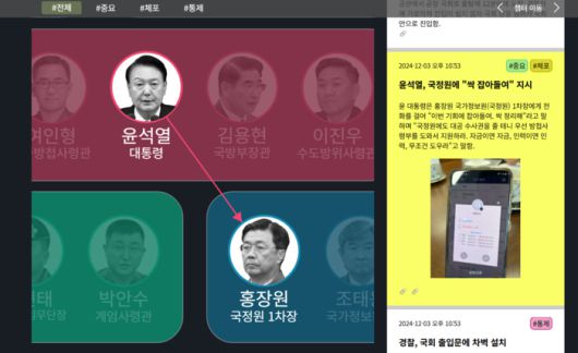 화면을 밑으로 내리는 것만으로 주요 사실들을 시간순으로 손쉽게 알 수 있습니다. 주요 인물 간 관계도는 누가 누구에게 지시를 내렸는지, 주요 인물 간 어떤 요청과 정보가 오갔는지를 파악하실 수 있게 도와줍니다. #중요, #체포, #통제 등의 버튼을 클릭하시면 중요 사건, 주요 인물 체포와 관련된 사건, ‘내란’의 주요 증거 중 하나인 국회 출입 통제와 관련된 사건만을 따로 모아서 보실 수 있습니다.