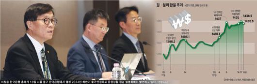 외환당국은 원·달러 환율 변동성이 커지면 적극적으로 개입하겠다는 의지를 내비쳤다. 이 총재는 "비상계엄 직후 환율 변동성이 높아져 개입 등으로 스무딩 오퍼레이션(미세 조정)을 했고 지금은 다시 안정돼서 전반적으로 달러화와 같이 움직이고 있다"고 평가했다. 이어 "외환보유액이 4000억 달러나 4100억 달러 밑으로 내려가는 정도는 아니다"라면서 "앞으로도 변동성이 커지면 계속 스무딩 오퍼레이션을 할 것"이라고 강조했다.