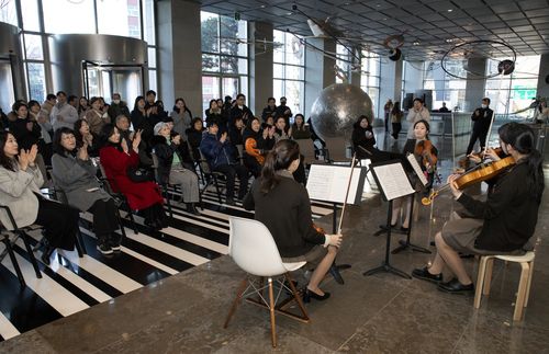 ▲ 태광그룹은 서울 정동에 위치한 예원학교 학생들이 지난 18일 광화문 흥국생명빌딩 1층 로비에서 클래식 연주회를 개최했다고 19일 밝혔다. 이번 연주회는 태광그룹 세화미술관이 '2024 해피뉴이어 해머링맨 프로젝트'로 마련한 첫 번째 문화·예술행사 프로그램이다. 세화미술관은 이날 청각장애인에게 소장품을 수어로 소개하는 행사도 마련했다. (서울=연합뉴스)