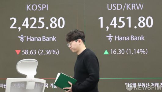 [서울=뉴스핌] 양윤모 기자 = 미 연방준비제도(연준)가 기준금리 인하 속도를 조절할 것임을 시사하자 뉴욕 증시가 급락한 가운데, 19일 오전 9시 코스피지수가 전 거래일 종가보다 58.51포인트(-2.36%) 하락한 2,425.92로, 코스닥지수는 16.24포인트(-2.33%) 하락한 681.33으로 오전 거래를 시작했다. 서울 외환시장에서 달러/원 환율은 전 거래일보다 16.70원(1.16%) 상승한 1,452.20원에 오전 거래를 시작한 가운데, 서울 중구 하나은행 딜링룸에서 직원들이 업무를 보고 있다. 2024.12.19 yym58@newspim.com