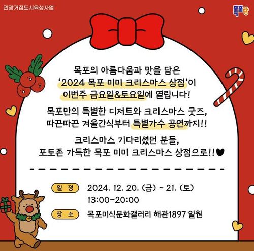 지난해에 이어 두 번째인 이번 행사는 아름답고 맛있는 도시 목포만의 감성을 담은 먹거리와 굿즈(팬 상품)가 있는 플리마켓(벼룩시장)에 크리스마스 분위기를 더하는 특색있는 경험을 선보인다.