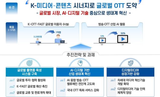 정부는 올해 6000억원 규모로 조성한 ‘K콘텐츠·미디어 전략 펀드’를 활용해 대형 콘텐츠 제작과 국내 OTT·FAST 기업의 기술 투자를 위한 자펀드를 조성할 계획이다. 해외 OTT·통신사들과의 협력 활성화를 위해 외교 협력을 추진하는 등 해외 진출 모델도 다각화할 계획이다.
