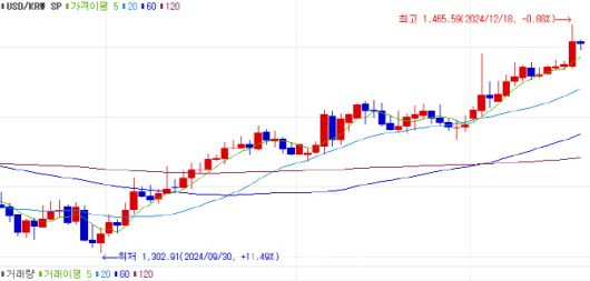 [이데일리 정두리 기자] 원·달러 환율이 금융위기가 한창이던 2009년 이후 처음으로 1450원선을 내줬다. 미국 기준금리 인하 지연 전망에 따른 달러 강세 충격이 예상보다 컸던 탓이다. 탄핵 정국 이후 계속되던 원화가치 하락에 미국의 통화 긴축 장기화 우려까지 더해지면서 금융시장이 흔들리는 모양새다.
