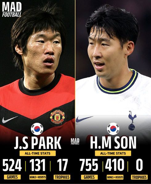 박지성은 프로 통산 트로피를 17개 챙겼다. 반면에 손흥민은 독일 분데스리가 함부르크, 바이엘 레버쿠젠 시절을 포함해도 아직까지 메이저 대회에서 어떠한 트로피도 들지 못했다.