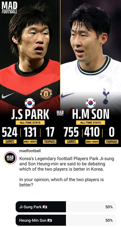 글로벌 축구매체 '매드풋볼'은 지난 19일(한국시간) 사회관계망서비스(SNS)를 통해 "대한민국 축구 레전드 박지성과 손흥민 중 누가 한국에서 더 잘하는 토론하고 있다. 두 선수 중 누가 더 나은가?"라며 설문조사를 진행했다.
