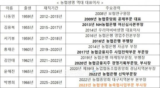 이번에 농협생명 부사장이 대표이사에 선임된 매우 파격적이 행보다. 출범 후 12년 동안 농협생명 역대 대표이사들은 직전 농협중앙회, 상호금융, 농협금융지주, 농협은행 임원에서 보험경력 없이 대표이사로 선임됐다.