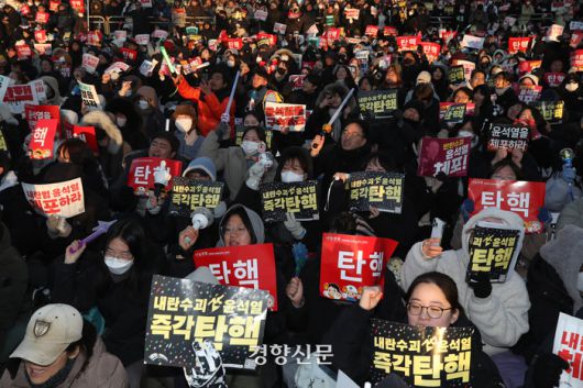 지난 14일 서울 여의도 국회 앞에서 열린 국민촛불대행진에 참석한 시민들이 윤석열 대통령 탄핵소추안 표결 결과를 기다리며 구호를 외치고 있다. 정효진 기자 |
