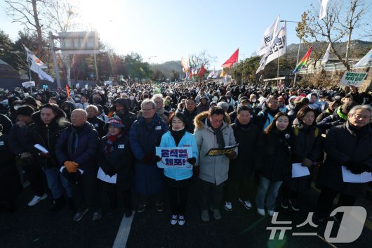 (서울=뉴스1) 박세연 기자 = 전국농민회총연맹 전봉준 투쟁단 농민들과 시민들이 22일 서울 남태령 고개 인근에서 윤석열 대통령 체포와 구속을 촉구하는 집회를 하고 있다. 2024.12.22/뉴스1