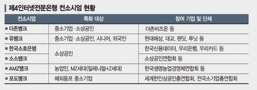 22일 금융권에 따르면 제4인뱅을 추진 중인 컨소시엄은 더존뱅크, 유뱅크, 한국소호은행, 소소뱅크, AMZ뱅크, 포도뱅크 등 6곳이다. 금융당국이 '자금조달력'과 '포용성'에 방점을 찍은 만큼 이들은 소상공인과 중소기업, 농민, 외국인 등 특정계층 특화은행을 표방하고 있다.