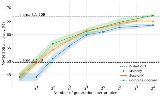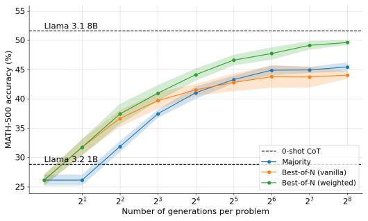 연구진은 프로세스 보상 모델(PRM)을 사용해 최종 답변뿐만 아니라 답변에 도달하는 과정도 평가했다. 실험 결과, 가중 베스트 오브 N과 PRM을 활용한 '라마-3.2 1B' 는 난이도가 높은 MATH-500 벤치마크에서 '라마-3.2 8B'에 가까운 성능을 보였다.
