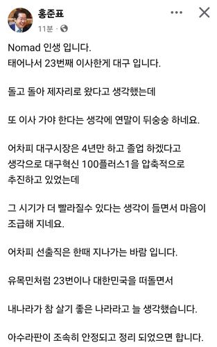 홍 시장은 이날 자신의 페이스북 글에서 "Nomad(유목민)인생이다. 태어나서 23번째 이사한 것이 대구"라면서 이같이 말했다.