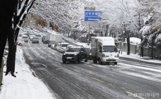 [인천=뉴시스] 김동영 기자 = 대설특보가 발효된 27일 오후 인천 남동구 인천문화예술회관 인근 도로에서 차량이 멈춰서 있다. 2024.11.27. dy0121@newsis.com /사진=김동영 |