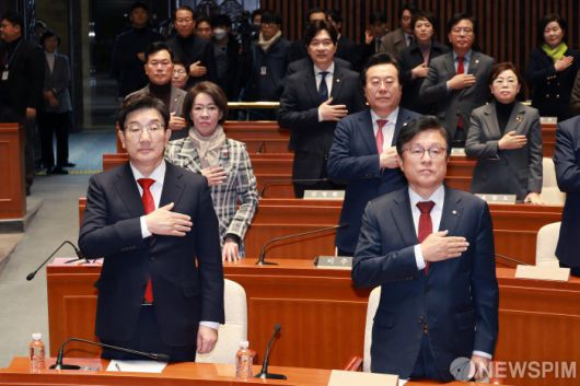 [서울=뉴스핌] 이형석 기자 = 권성동 국민의힘 원내대표(왼쪽)를 비롯한 의원들이 24일 오전 서울 여의도 국회에서 열린 의원총회에서 국기에 대한 경례를 하고 있다. 2024.12.24 leehs@newspim.com