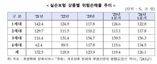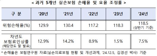 최근 5년간 실손보험 전체 손해율은 △2020년 129.9% △2021년 130.4% △2022년 117.2% △2023년 118.3% △2024년 상반기 118.5%다. 손해율이 100%를 넘어서면 받은 보험료보다 나간 보험금이 더 많다는 의미다.