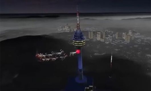 북미항공우주방위사령부(NORAD)가 25일 공식 웹사이트 등을 통해 공개한 산타의 실시간 위치 추적 경로에 따르면, 산타는 24일 밤 11시24분쯤 제주 서귀포 남쪽 상공으로 진입해 부산을 시작으로 한반도 구석구석을 지나며 어린이들에게 2000만개 넘는 선물을 나눠 줬다. NORAD가 공개한 영상에는 산타가 탄 썰매가 여의도 63빌딩과 남산 서울타워(사진)를 한 바퀴씩 돌고, 잠실 롯데월드타워와 경복궁 위를 지나 서울을 빠져 나갔다. 산타가 한국 상공에 머문 시간은 약 3분45초였다.
