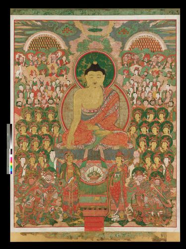 해인사의 영산회상도는 비단 바탕에 석가여래가 설법하는 장면을 묘사한 그림이다.