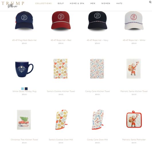 트럼프 그룹은 트럼프 스토어에서 트럼프 이름이 새겨진 다양한 굿즈를 판매하고 있다. 트럼프 스토어에는 트럼프 당선인이 제45대·47대 대통령이라는 점을 부각하는 ‘45-47’ 문구가 새겨진 야구모자(38달러), 스웨터(195달러), 재떨이(85달러) 등을 판매하고 있다.