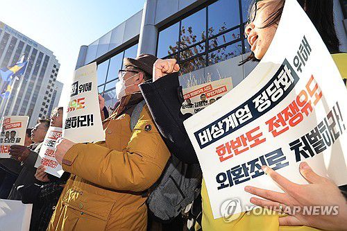 (서울=연합뉴스) 신현우 기자 = 26일 오전 서울 서대문구 경찰청 국가수사본부 앞에서 '평화와 연대를 위한 접경지역 주민·종교·시민사회 연석회의', '윤석열 즉각퇴진·사회대개혁 비상행동' 관계자들이 윤석열 대통령과 김용현 전 국방부 장관, 여인형 국군방첩사령관, 노상원 전 정보사령관을 외환죄 혐의로 고발하기에 앞서 기자회견을 하며 구호를 외치고 있다. 2024.12.26