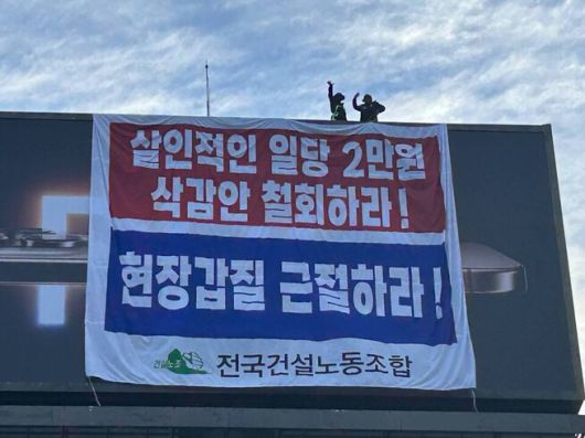 건설노조 조합원 2명은 지난 10월2일부터 31일까지 30일간 서울 여의도 여의2교 부근 광고탑에 올라가 사용자 쪽에 내년 일당 2만원 삭감안 철회 등을 요구했다. 경찰은 이 과정에서 업무방해와 건조물 침입, 재물 손괴 등이 발생했다며 조합원 2명을 수사 중이다.