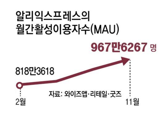 알리 역시 초저가를 무기로 국내에 야심 차게 진출했지만 K커머스에 비해 점유율이 미미한 수준이다. 와이즈앱 리테일 굿즈에 따르면 알리익스프레스의 월간 활성 이용자 수(MAU)는 올해 11월 967만6267명으로 쿠팡(3219만 명)에 이은 2위다. 하지만 데이터플랫폼 기업 아이지에이웍스 모바일인덱스에 따르면 지난달 이커머스 시장에서 알리익스프레스의 카드 결제 금액 점유율은 3.4%에 불과했다. 올해 1월 1.3%였던 것에 비하면 높아졌지만, 아직 존재감이 크지 않다는 평가다.