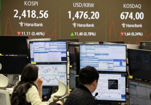 27일 국내 증시는 소폭 하락 출발했고 원·달러 환율은 2009년 금융위기 이후 처음으로 장중 1475원을 넘어섰다. 서울 을지로 하나은행 본점 딜링룸에서 직원들이 업무를 보고 있다. 허영한 기자 |