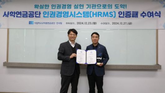 사립학교교직원연금공단은 23일 인권경영시스템(HRMS) 인증을 최초로 획득했다고 27일 밝혔다. HRMS는 대상 기관이 인권경영을 위해 방침과 목표를 정하고 그 실행을 위한 체계 등의 요건을 갖추었는지를 점검하기 위해 제3자의 적정성 심사를 거쳐 한국경영인증원(KMR)이 부여하는 제도다.